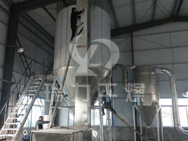 原理: 空氣經過過濾和加熱,進入干燥器頂部空氣分配器,熱空氣呈螺旋狀均勻地進入干燥室。料液經塔體頂部的高速離心霧化器(旋轉)噴霧成極細微的霧狀液珠,與熱空氣并流接觸,在極短的時間內可干燥為成品。成品連續地由干燥塔底部和旋風分離器中輸出,廢氣由風機排空。