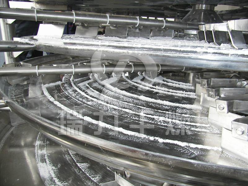 濕物料自加料器連續地加到干燥器上部第一層干燥盤上,帶有耙葉的耙臂作回轉運動使耙葉連續地翻抄物料。物料沿指數螺旋線流過干燥盤表面,在小干燥盤上的物料被移送到外緣,并在外緣落到正下方的大干燥盤外緣,在大干燥盤上物料向里移動并從中間落料口落入下一層小干燥盤中,由于大小干燥盤上下交替排列,物料得以連續的流過整個干燥器。中空的干燥盤內通入加熱介質,加熱介質飽和蒸氣由干燥盤的一端進入,從另一端導出,已干物料從最后一層干燥盤落到殼體的底層,最后被耙葉移送到出料口排出,從底層排出的干物料可直接包裝。