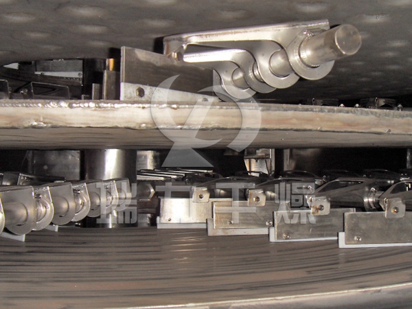 濕物料自加料器連續(xù)地加到干燥器上部第一層干燥盤上,帶有耙葉的耙臂作回轉(zhuǎn)運(yùn)動(dòng)使耙臂作回轉(zhuǎn)運(yùn)動(dòng)使耙葉連續(xù)地翻抄物料。物料沿指數(shù)螺旋線流過干燥盤表面,在小干燥盤上的物料被移送到外緣,并在外緣落到下方的大干燥盤外緣,在大干盤上物料向里移動(dòng)并從中間落料口落如下一層小干燥盤中。大小干燥盤上下交替排列,物料得以連續(xù)地流過整個(gè)干燥器。中空的干燥盤內(nèi)通入加熱介質(zhì),加熱介質(zhì)形式有飽和蒸汽、熱水和導(dǎo)熱油,加熱介質(zhì)由干燥盤的一端進(jìn)入,從另一端導(dǎo)出。已干物料從最后一層干燥盤落到殼體的底層,最后被耙葉移送到出料口排出。濕份從物料中逸出,由設(shè)在頂蓋上的排濕口排出,真空型盤式干燥器的濕氣由設(shè)在頂蓋上的真空泵口排出。從底層排出的干物料可直接包裝。通過配加翅片加熱器、溶劑回收冷凝器、袋式除塵器、干料返混機(jī)構(gòu)、引風(fēng)機(jī)等輔機(jī),可提高其干燥的生產(chǎn)能力,干燥膏糊狀和熱敏性物 料,可方便地回收溶劑,并能進(jìn)行熱解和反應(yīng)操作。