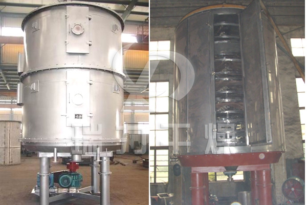 濕物料自加料器連續(xù)地加到干燥器上部第一層干燥盤(pán)上,帶有耙葉的耙臂作回轉(zhuǎn)運(yùn)動(dòng)使耙臂作回轉(zhuǎn)運(yùn)動(dòng)使耙葉連續(xù)地翻抄物料。物料沿指數(shù)螺旋線流過(guò)干燥盤(pán)表面,在小干燥盤(pán)上的物料被移送到外緣,并在外緣落到下方的大干燥盤(pán)外緣,在大干盤(pán)上物料向里移動(dòng)并從中間落料口落如下一層小干燥盤(pán)中。大小干燥盤(pán)上下交替排列,物料得以連續(xù)地流過(guò)整個(gè)干燥器。中空的干燥盤(pán)內(nèi)通入加熱介質(zhì),加熱介質(zhì)形式有飽和蒸汽、熱水和導(dǎo)熱油,加熱介質(zhì)由干燥盤(pán)的一端進(jìn)入,從另一端導(dǎo)出。已干物料從最后一層干燥盤(pán)落到殼體