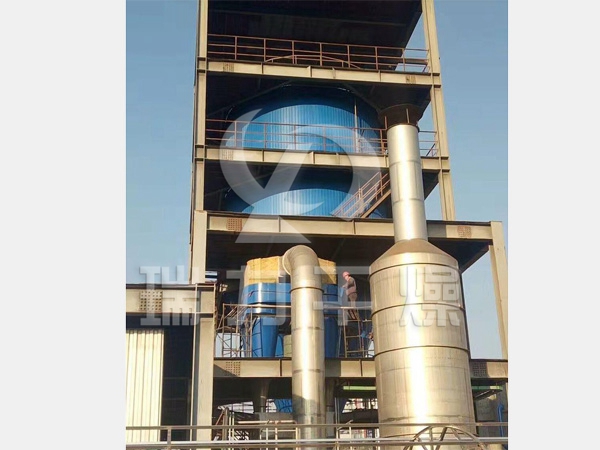本機組工作過程為:料液通過隔膜泵高壓輸入,噴出霧狀液滴,然后同熱空氣并流下降,大部分粉粒由塔底排料口收集,廢氣及其微小粉末經(jīng)旋風分離器分離,廢氣由抽風機排出,粉末由設在旋風分離器下的收粉筒收集,風機出口處還可裝備二級除塵裝置,回收率在96%-98%。