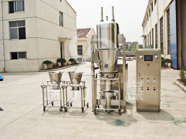 底噴工藝(包衣): 物料加入流化床的料斗內,通過在料斗內增設一個上下兩端開口的隔圈以及與之對應的具有不同開孔率的篩板,以控制物料運動形成有序的流化狀態。噴液通過安裝于篩板中心的氣動噴嘴加入到系統中,其方向與物料運動方向相同。隔圈與篩板之間有一定的間距,以保證物料能順暢地從隔圈外流向隔圈內,形成循環往復的流動狀態。被包的顆粒經過隔圈,在擴展室開始減速。當顆粒上升到擴展室時,多余的介質被蒸發掉,當氣流速度無法推動顆粒運動時,顆粒重新回落到隔圈與料斗之間的間隙內,此處的氣流量只要能使得顆粒向下運動,且保持失重的懸浮狀態就夠了。顆粒從隔圈與料斗壁之間的區域內水平地運動到包衣區域內,形成一個運動循環,這是通過正確地調節隔圈底部與篩板之間的間隙來實現的,顆粒在幾秒鐘內通過包衣區域,完成一個運動循環。噴入的包衣液與丸芯接觸后,在干燥空氣的熱力作用下,包衣液中的水分蒸發,丸芯被噴涂,最終得到符合標準的包衣丸。