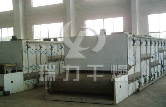 三、工作原理: 中藥專用帶式干燥機的物料由加料器均勻地鋪在網帶上,網帶一般采用12-60目不銹鋼絲網,由傳動裝置拖動在干燥機內移動。干燥機由若干單元組成,每一單元熱風獨立循環,部分尾氣由專門排濕風機排出,廢氣由調節閥控制,熱氣由下往上或由上往下穿過鋪滿物料的網帶完成熱量與質量傳遞的進程,帶走物料水份。網帶緩慢移動,運行速度可根據物料溫度自由調節,干燥后的成品連續落入收料器中。上下循環單元根據用戶需要可靈活配備,單元數量亦可根據需要選取。